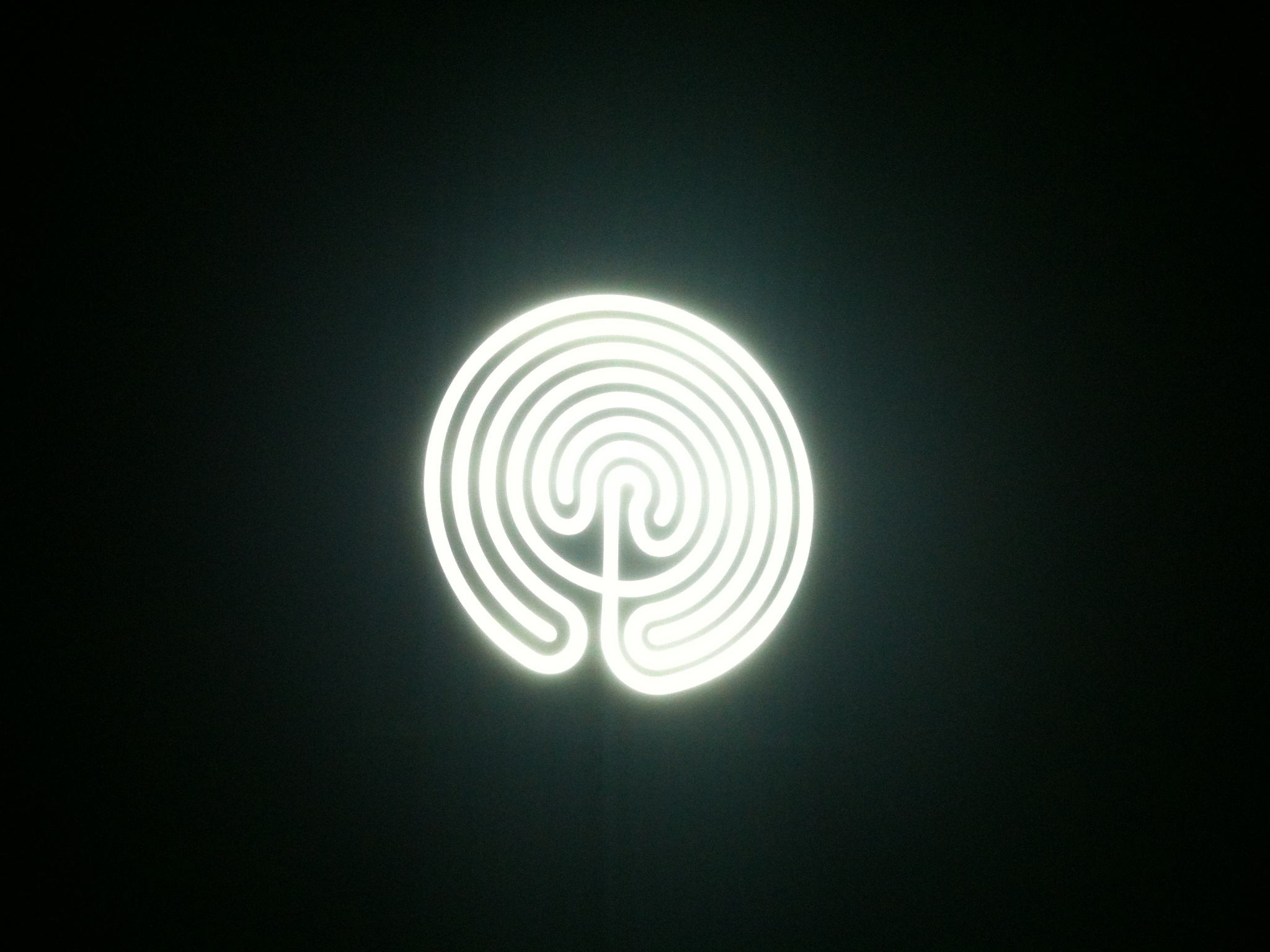 Installation, Espace Labyrinthique et Cartographie sculpture Néon _ Sol de sel fin blanc, Mur rideaux de théâtre noirs, au centre du Labyrinthe : enseigne lumineuse / Performance : Thésée gravit la Montagne.