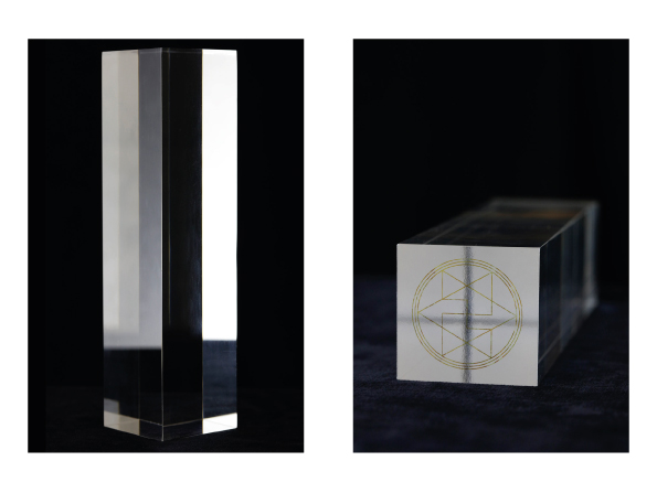 Matériaux et Dimension : Plexiglas 4x4x30 cm / Onde de Forme Protection impression sur stickers.
